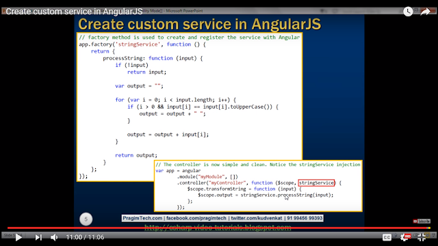 app.controller("myController", function ($scope, myService, myFactory, myProvider) { // service function call $scope.ServiceOutput = "Look for service output here."; $scope.HelloService = function () { $scope.ServiceOutput = myService.Hello(); }; $scope.SumService = function () { $scope.ServiceOutput = "The sum is : " + myService.Sum(2, 5); }; // factory function call $scope.FactoryOutput = "Look for factory output here."; $scope.HelloFactory = function () { $scope.FactoryOutput = myFactory.Hello(); }; $scope.SumFactory = function () { $scope.FactoryOutput = "The sum is : " + myFactory.Sum(22, 5); }; // provider function call $scope.ProviderOutput = "Look for factory output here."; $scope.HelloProvider = function () { $scope.ProviderOutput = myProvider.Hello(); }; $scope.SumProvider = function () { $scope.ProviderOutput = "The sum is : " + myProvider.Sum(22, 52); }; });